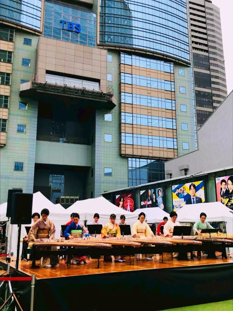 華やかな着物姿で並んだお箏の音色が、都会の真ん中にやさしく響き渡り、