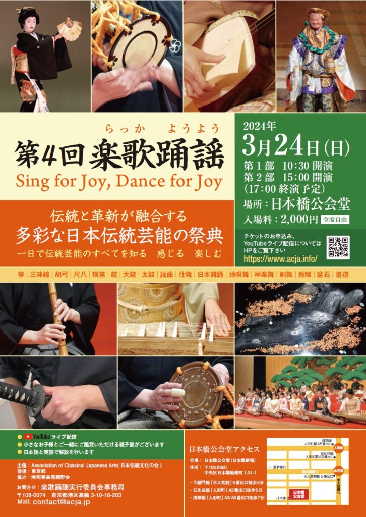 伝統と革新が融合する 多彩な日本伝統芸能の祭典 『第4回 楽歌踊謡(らっかようよう)Sing for Joy , Dance for Joy』のご案内です。